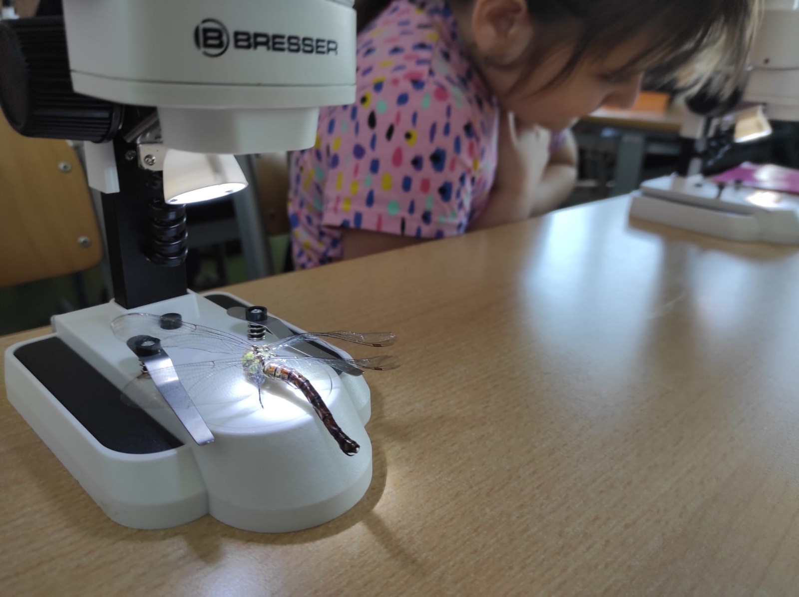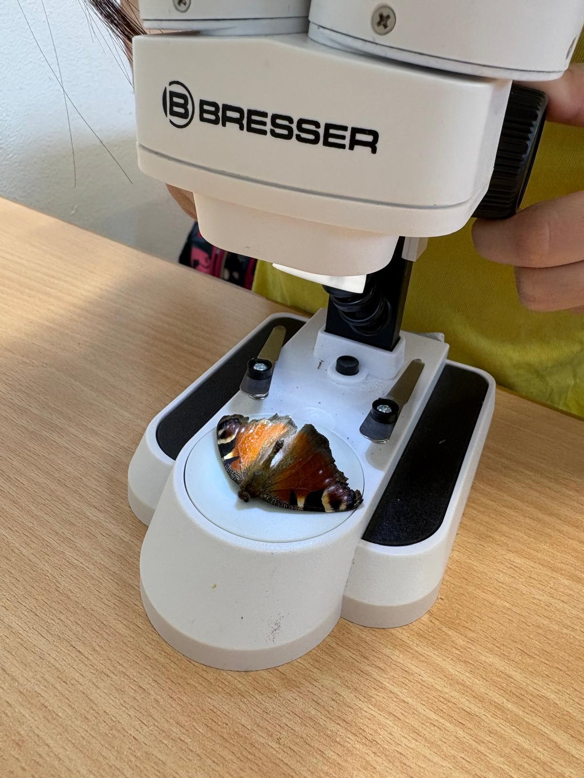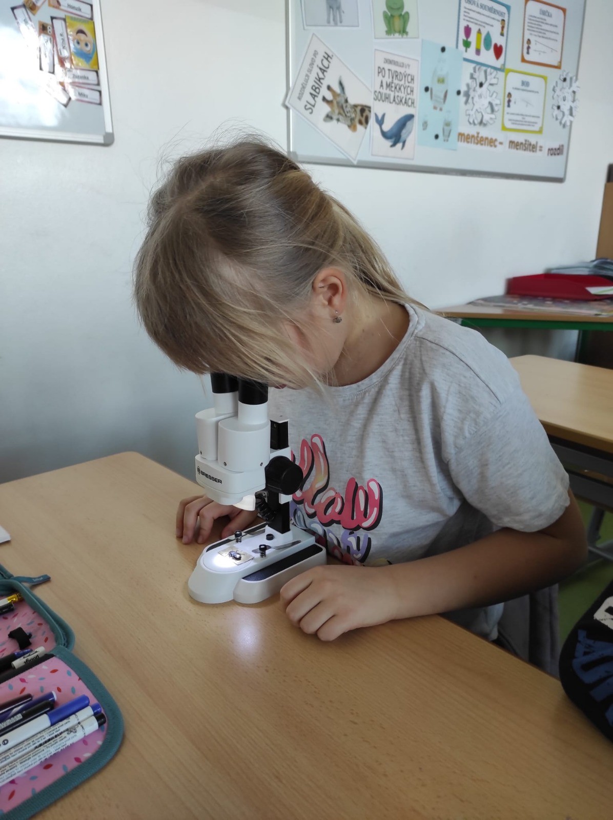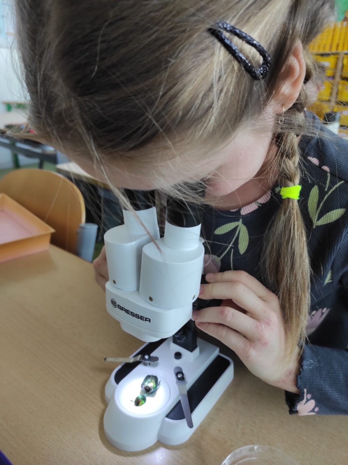 Druháci si mohli zblízka prohlédnout například brouky, motýlí křídla, vážku nebo kapradinu. S úžasem sledovali detaily, které pouhým okem nejsou vidět – tykadla, drobné chloupky i zajímavou stavbu tělíček. Deváťáci trpělivě vysvětlovali, jak se s mikroskopem pracuje, jak se správně nastaví ostrost a na co si dát pozor.